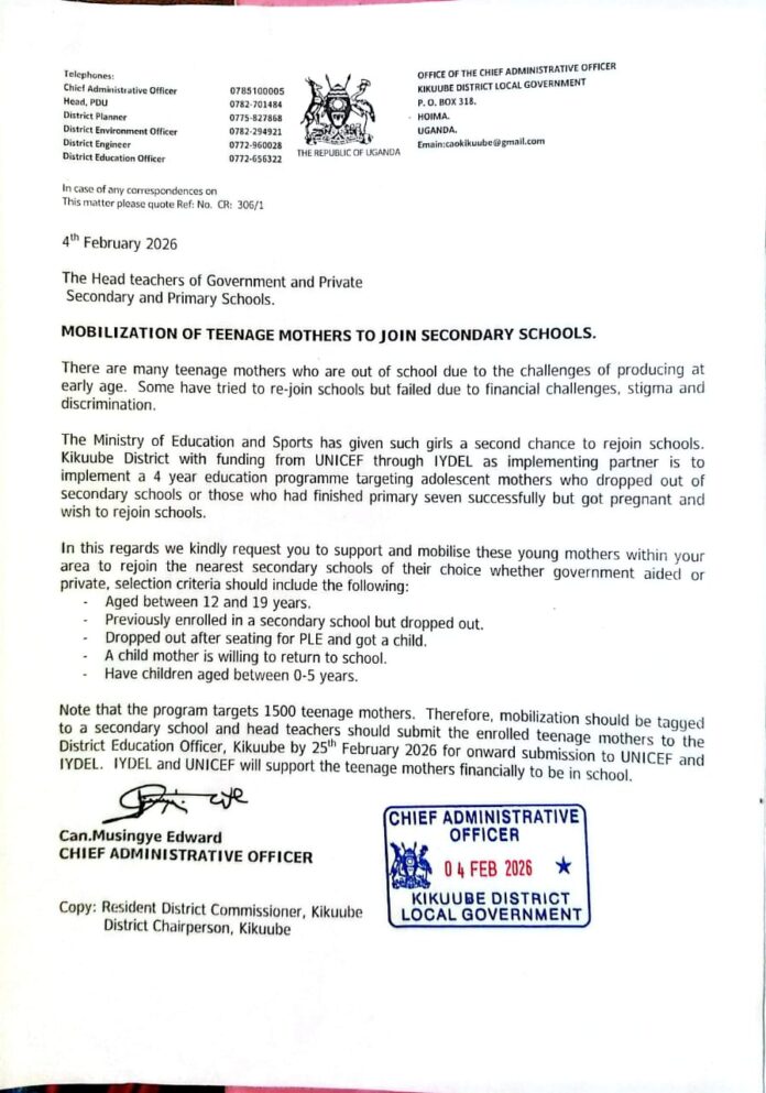 At least 1,500 teenage mothers in Kikuube District now have a renewed opportunity to return to school following a four-year education initiative launched by the district education department with support from the United Nations Children’s Fund (UNICEF). The programme aims to reintegrate adolescent mothers who dropped out of secondary school due to pregnancy or financial hardship, as well as those who became pregnant after sitting for the Primary Leaving Examination (PLE).
